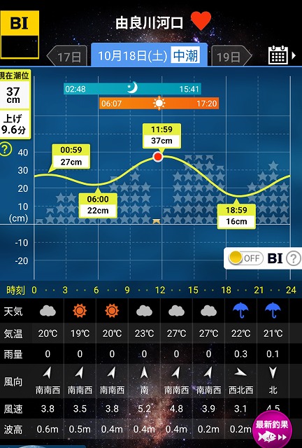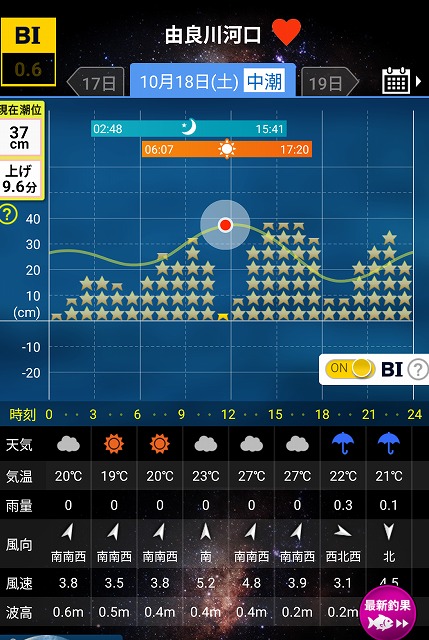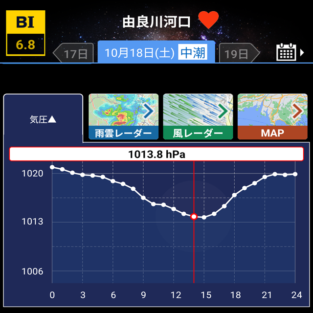 アプリ上で気圧が下がり始めている+潮が動き始めているなら、