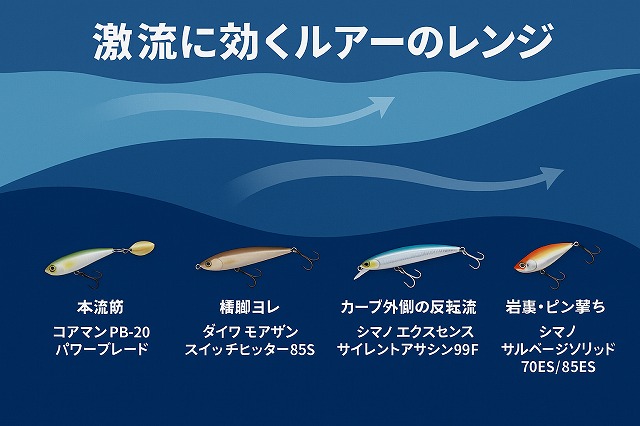 | 本流筋 | コアマン PB-20 パワーブレード | 激流の中でもレンジをキープできる“鉄板ブレード”の代表格。コンパクトながら強波動を生み、流れを切り裂くスリム設計でドリフト性能も抜群。 |