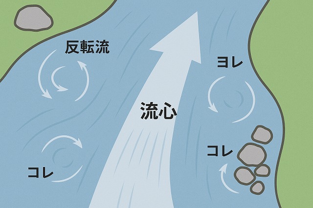 アップクロスにキャストして、流れに任せながらヨレへと送り込むナチュラルドリフトが最も効果的です。