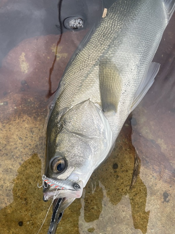 その直後、流心から飛び出した60クラスのシーバスがロッドを絞り込みました。